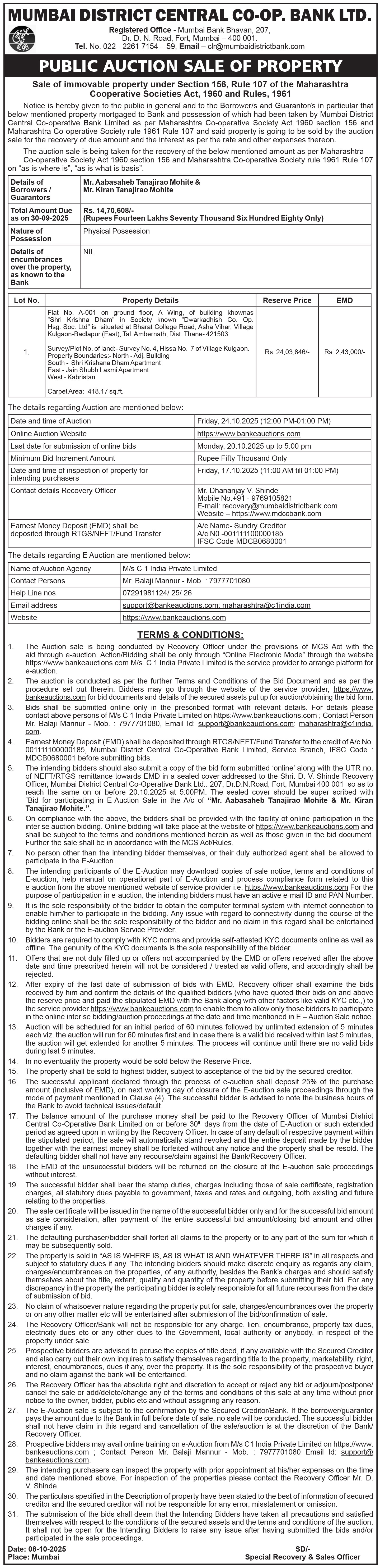 श्री. मनोज नरोत्तमदास ढाका ची ई लिलाव विक्री सूचना इंग्रजी मध्ये. |